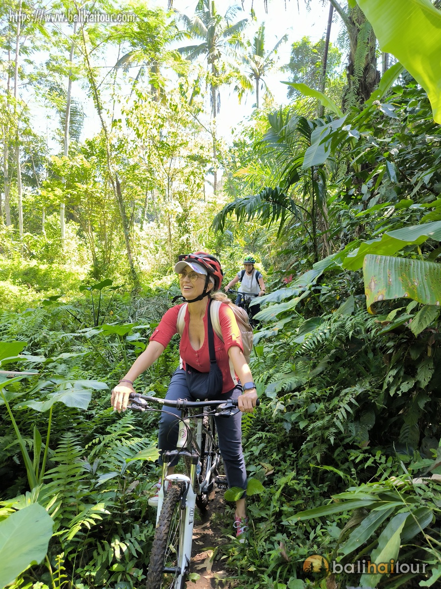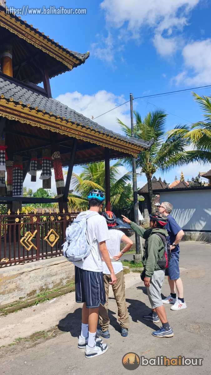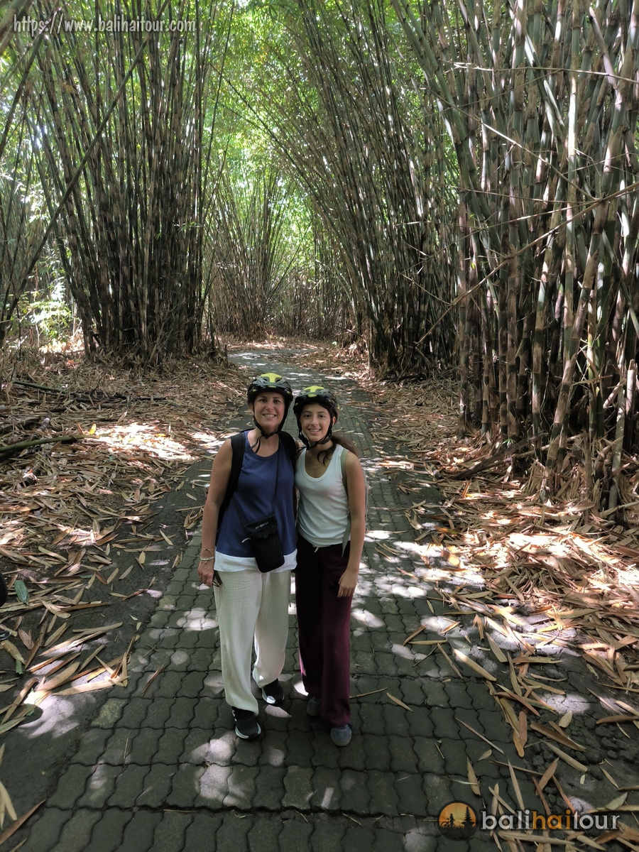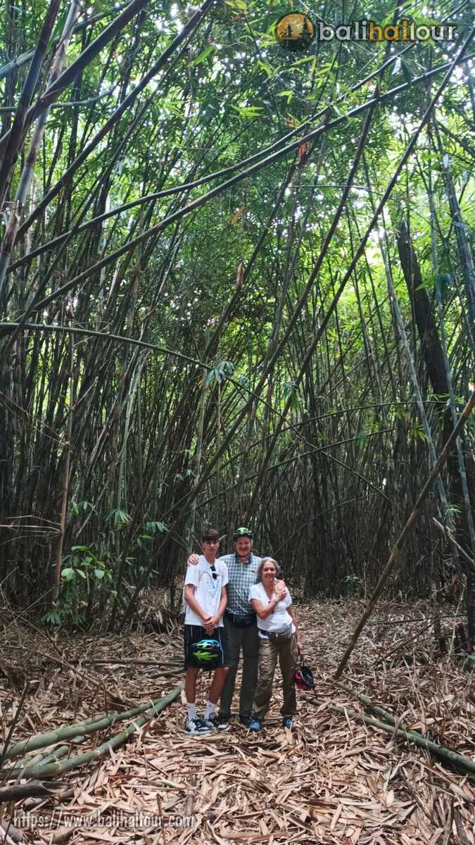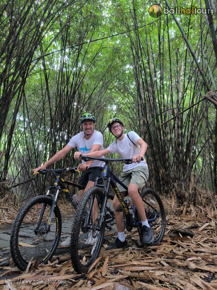Bali countryside cycling tour photos from our 2025 Italian guests, showing rides through bamboo forest, lush rice paddies, Kehen Temple, village farms, traditional handicrafts, and hidden back-road scenery